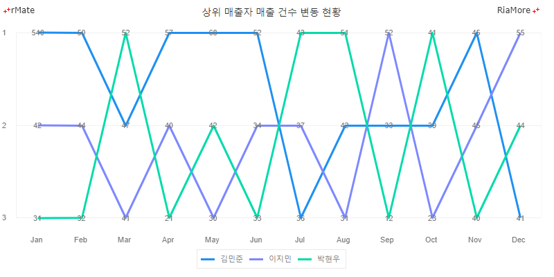 다음은 범프 차트를 생성하는 코드와 이를 적용해서 출력한 차트의 예제입니다. 이 예제에서는 월별로 변동되는 매출 건수를 직선으로 연결하여 표현합니다.